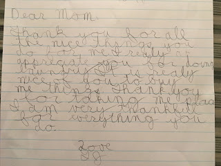 TJ is definitely a sweet boy. His note reflects his thoughtfulness. We note his sincerity when he prays for the family and is thankful for a "Good" day