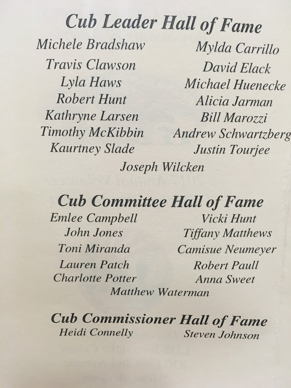 Heidi has been a hard-working scouter for many years. Tonight Heidi was recognized by being added to the Cub Leader Hall of Fame.